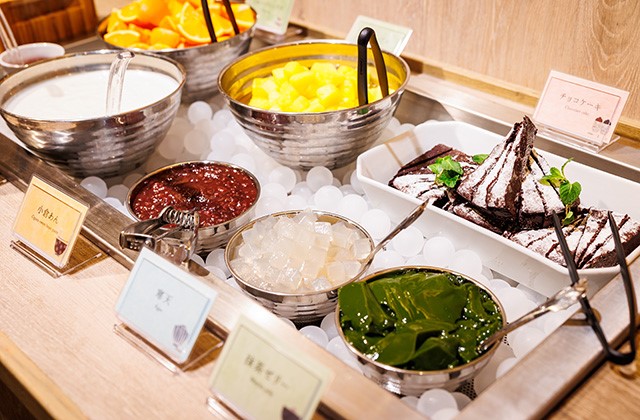 フルーツやケーキのほか、あんみつなどの和スイーツも。