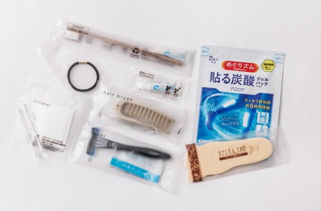 Amenity Station | Toothbrush, razor, hairbrush, body towel, makeup remover, facial cleanser, toner, moisturizer, sunscreen, hair ties, cotton swabs, cotton pads, various bath salts, toe pads, tea, green tea, black tea, cocoa, coffee set, children's toothbrush, children's slippers, children's body sponge, foot wipes, sweat wipes (summer only) |