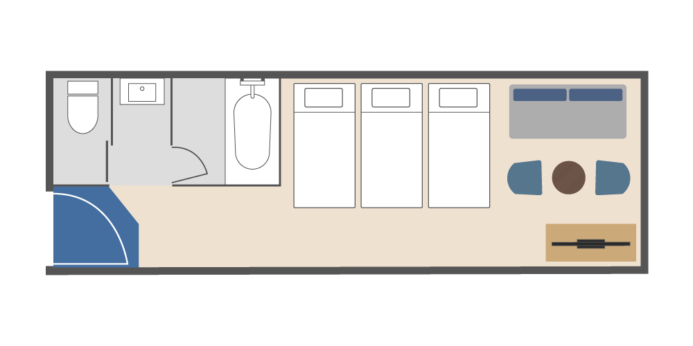 Room features | Separate bathtub, bidet toilet, sink, individual air conditioning system, internet connection (Wi-Fi), emergency lighting, flame-retardant hood |