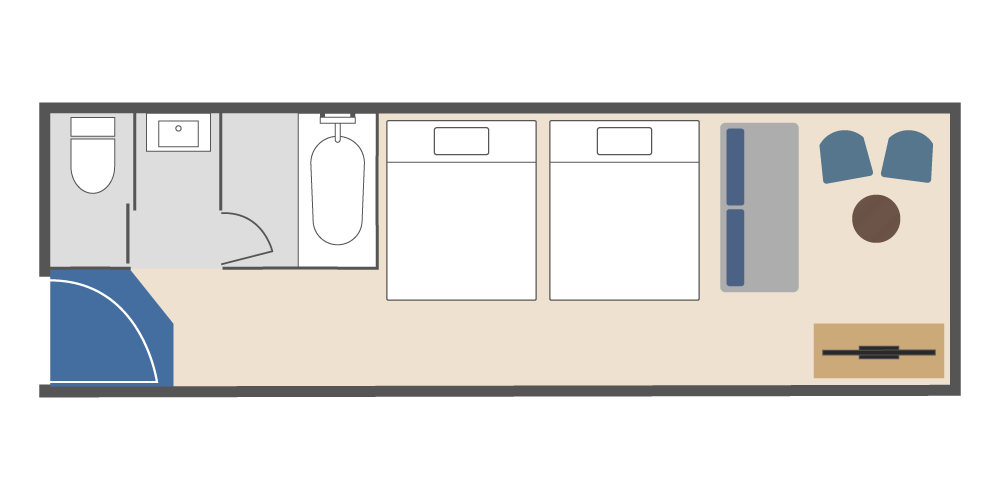 Room features | Separate bathtub, bidet toilet, sink, individual air conditioning system, internet connection (Wi-Fi), emergency lighting, flame-retardant hood |