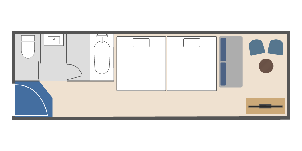 Room features | Separate bathtub, bidet toilet, sink, individual air conditioning system, internet connection (Wi-Fi), emergency lighting, flame-retardant hood |