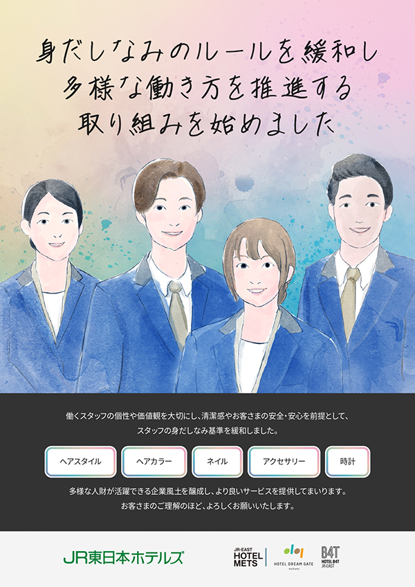 清潔感やお客さまの安心・安全を前提として、ヘアスタイル、ヘアカラー、ネイル、アクセサリー、腕時計などの基準を見直し、スタッフがより自分らしく働ける環境づくりを進めてまいります。
